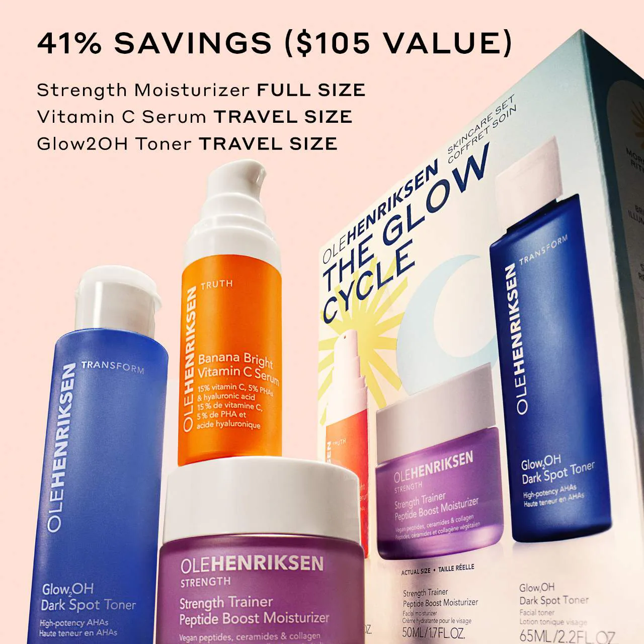 What Else You Need to Know: Target major signs of aging1 dullness, uneven texture, and dryness1 with this powerful three-step routine. In the morning, instantly brighten and firm skin over time with Banana Bright Vitamin C Serum. At night, retexturize and visibly reduce dark spots with Glow2OH Dark Spot Toner. Morning and night, deeply hydrate and strengthen your moisture barrier with Strength Trainer Peptide Boost Moisturizer.